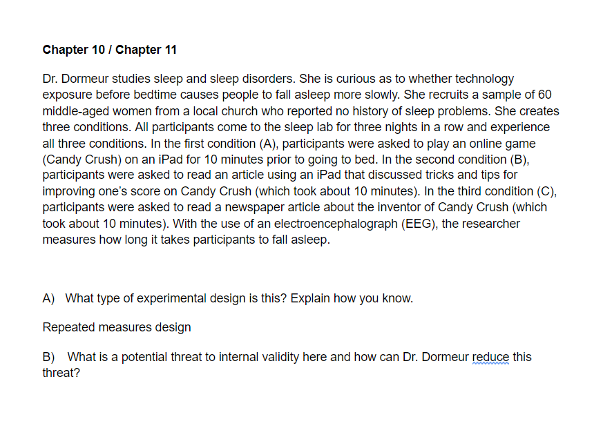Which of the following designs is Dr. She creates three conditions. Dormeur studies sleep and sleep disorders.